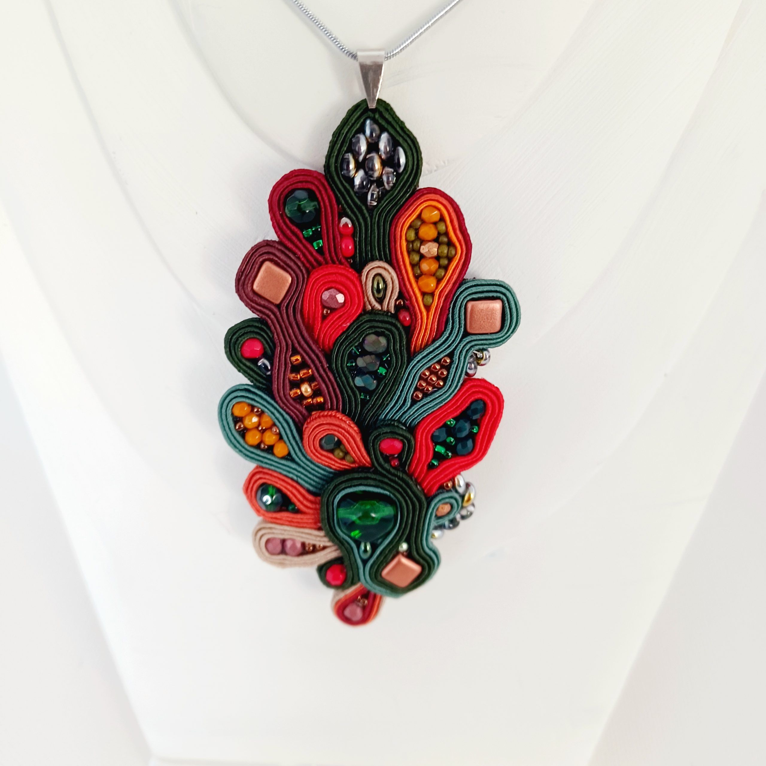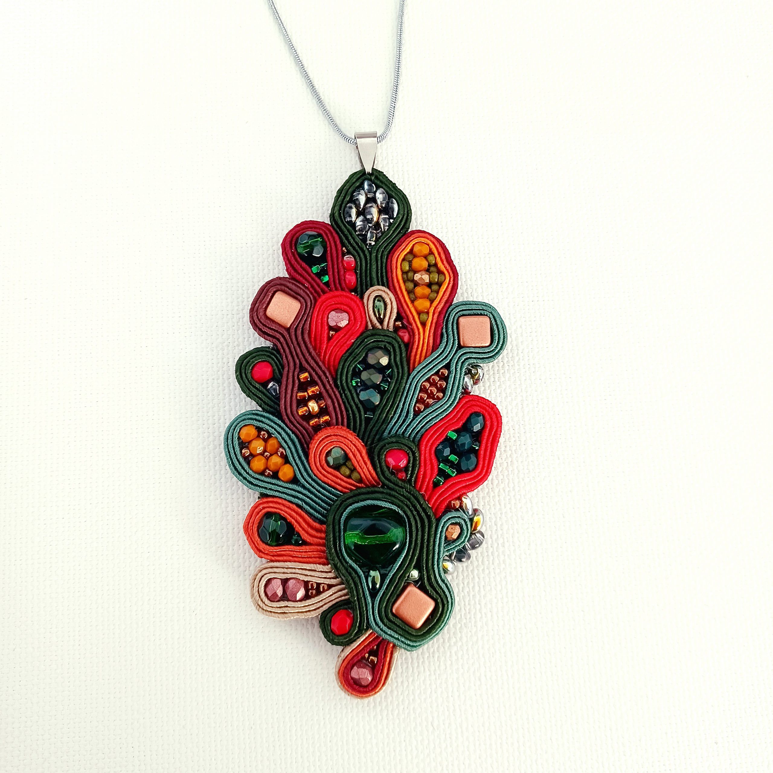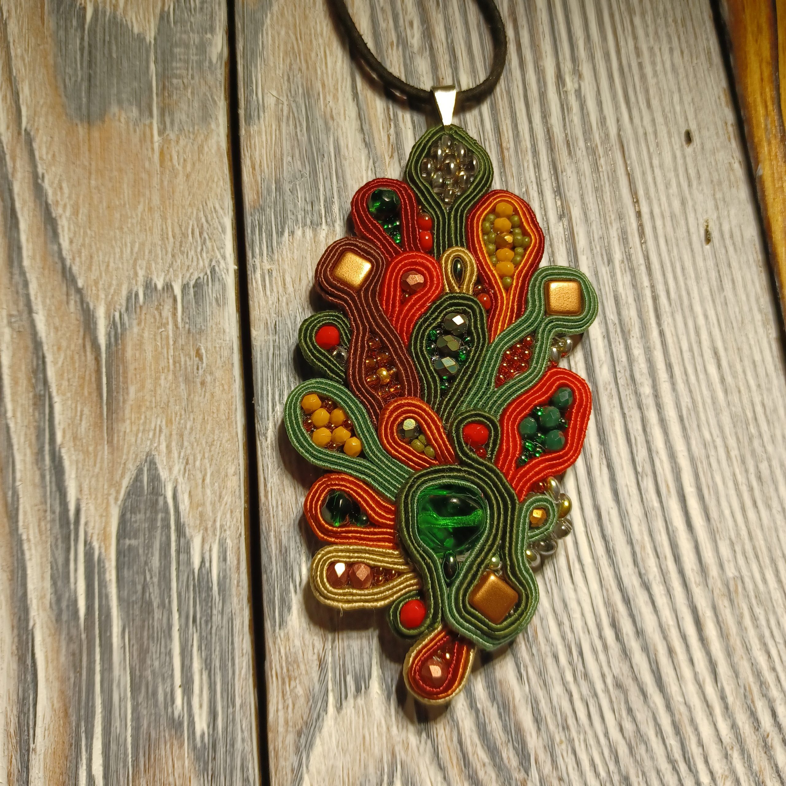 Efektowny wisior wykonany techniką haftu sutaszowego w cieplych barwach.