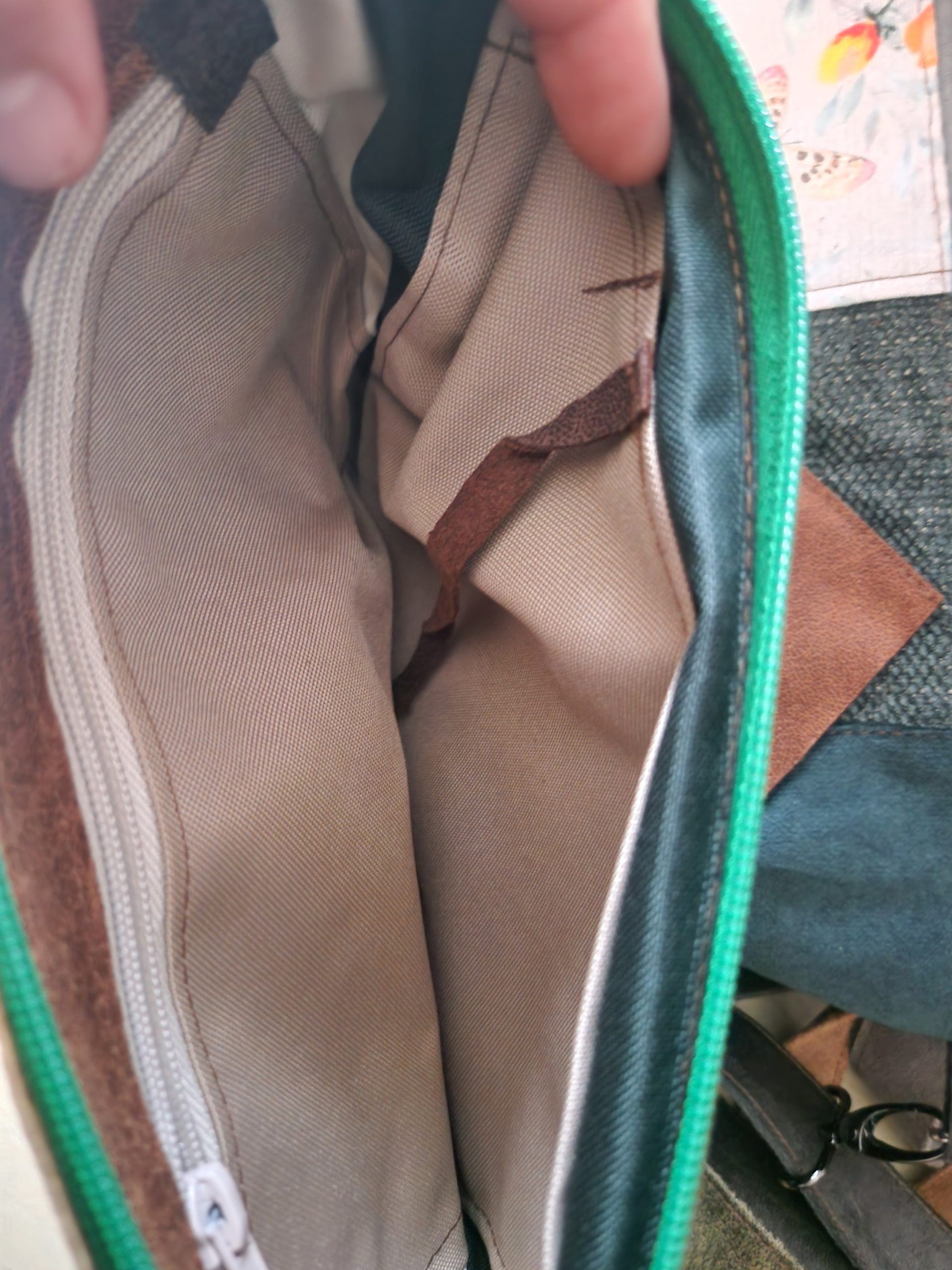 Nerka została wykonana ze skory tapicerskiej, welurów oraz innych tkanin zero waste. Podszewka wykonana z kodury lub bawełny.