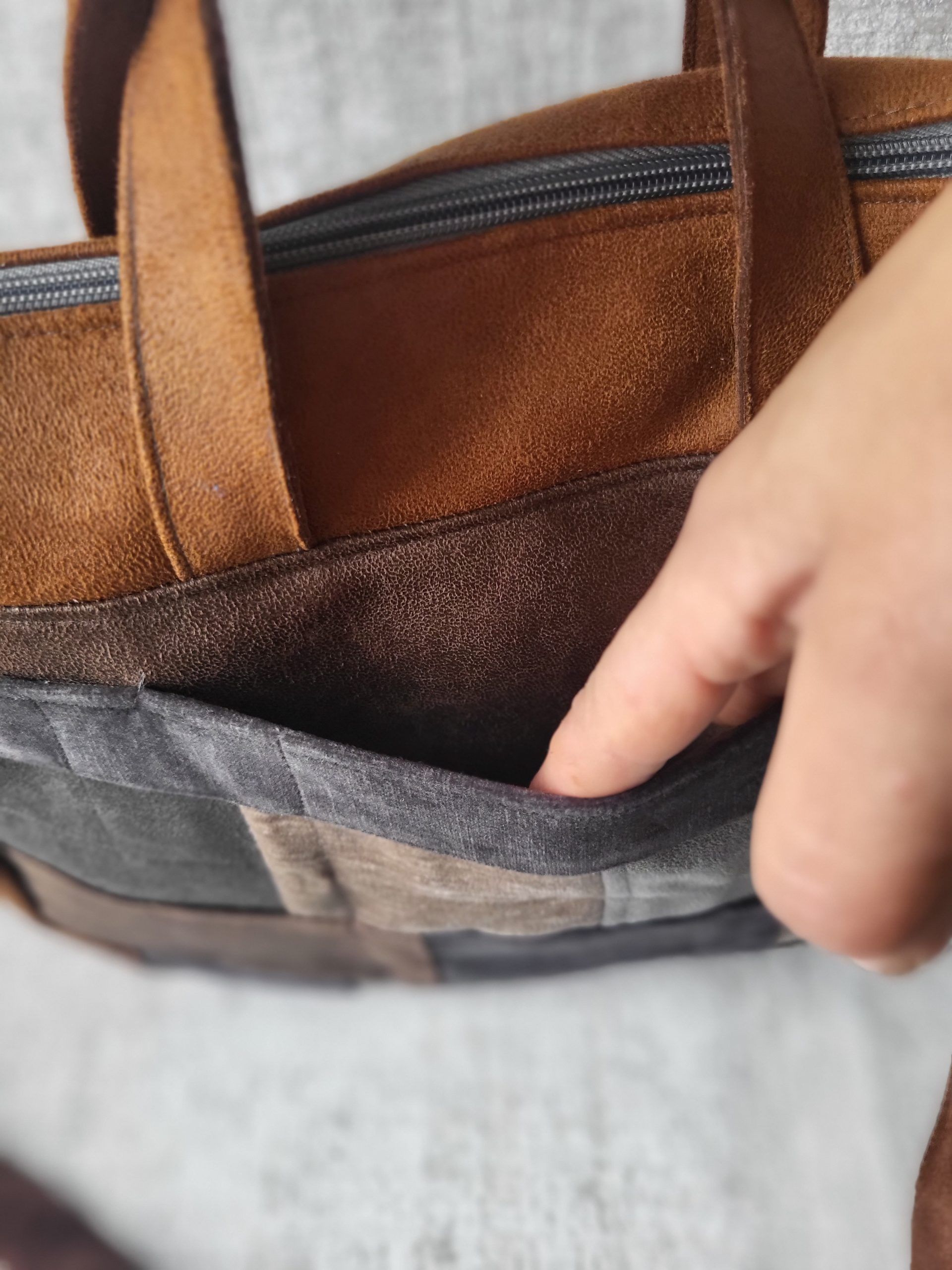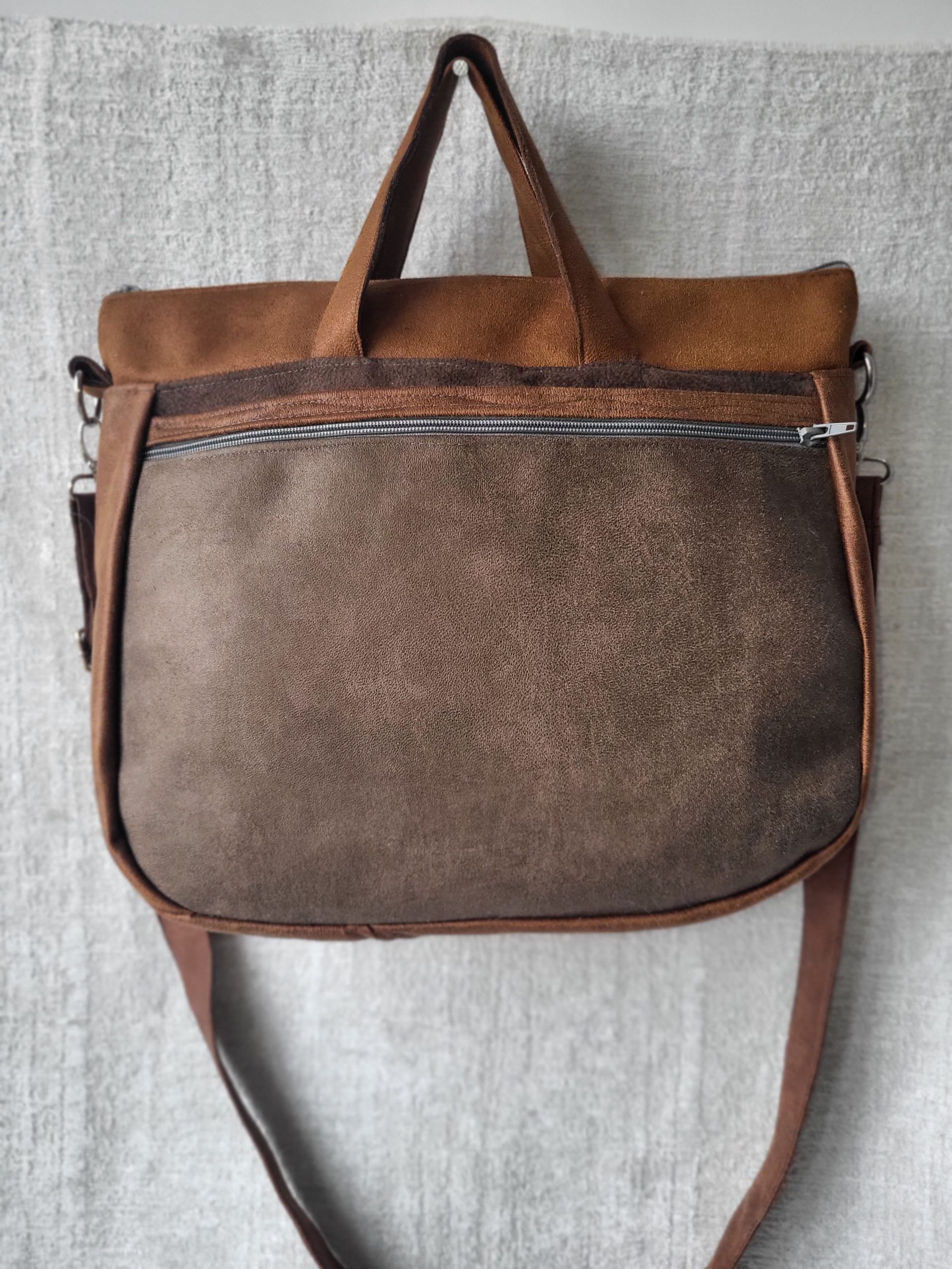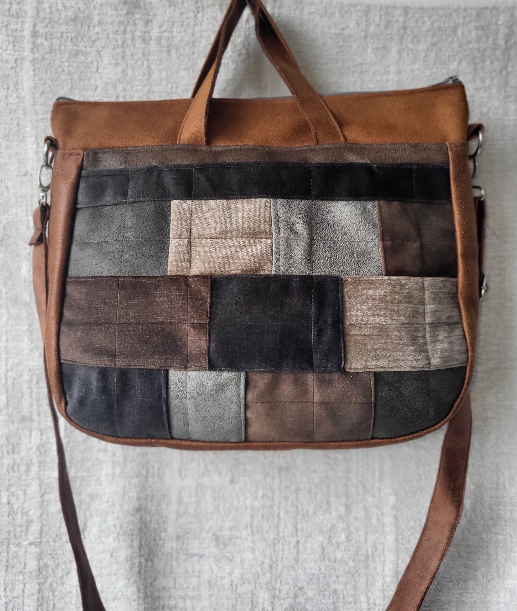 Torebka „Midi” czyli średniej wielkości, wykonana ze skóry i weluru tapicerskiego.