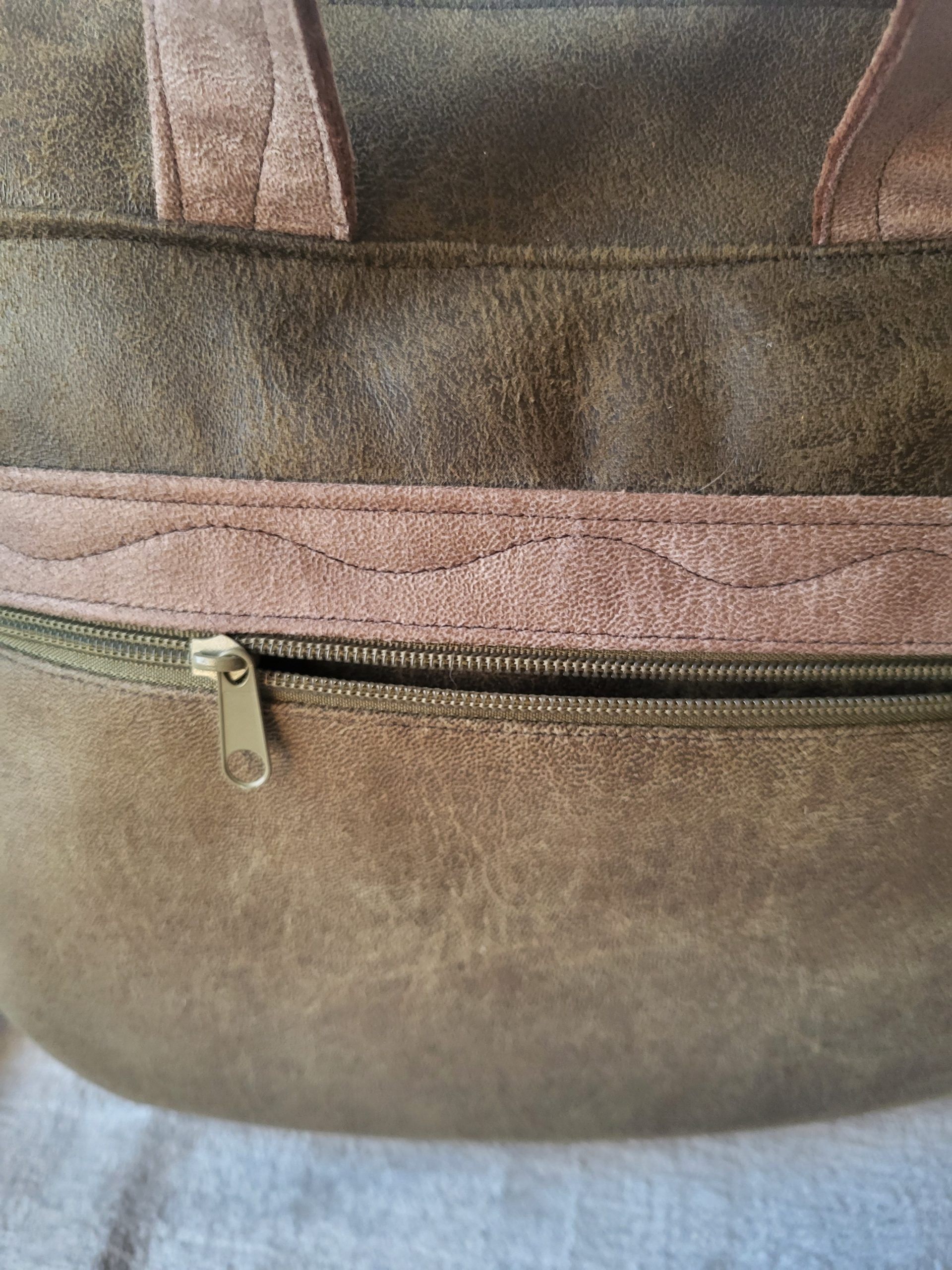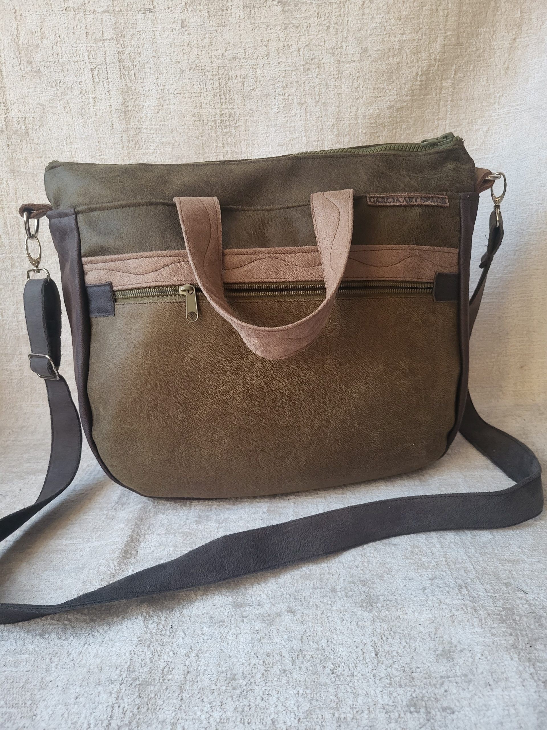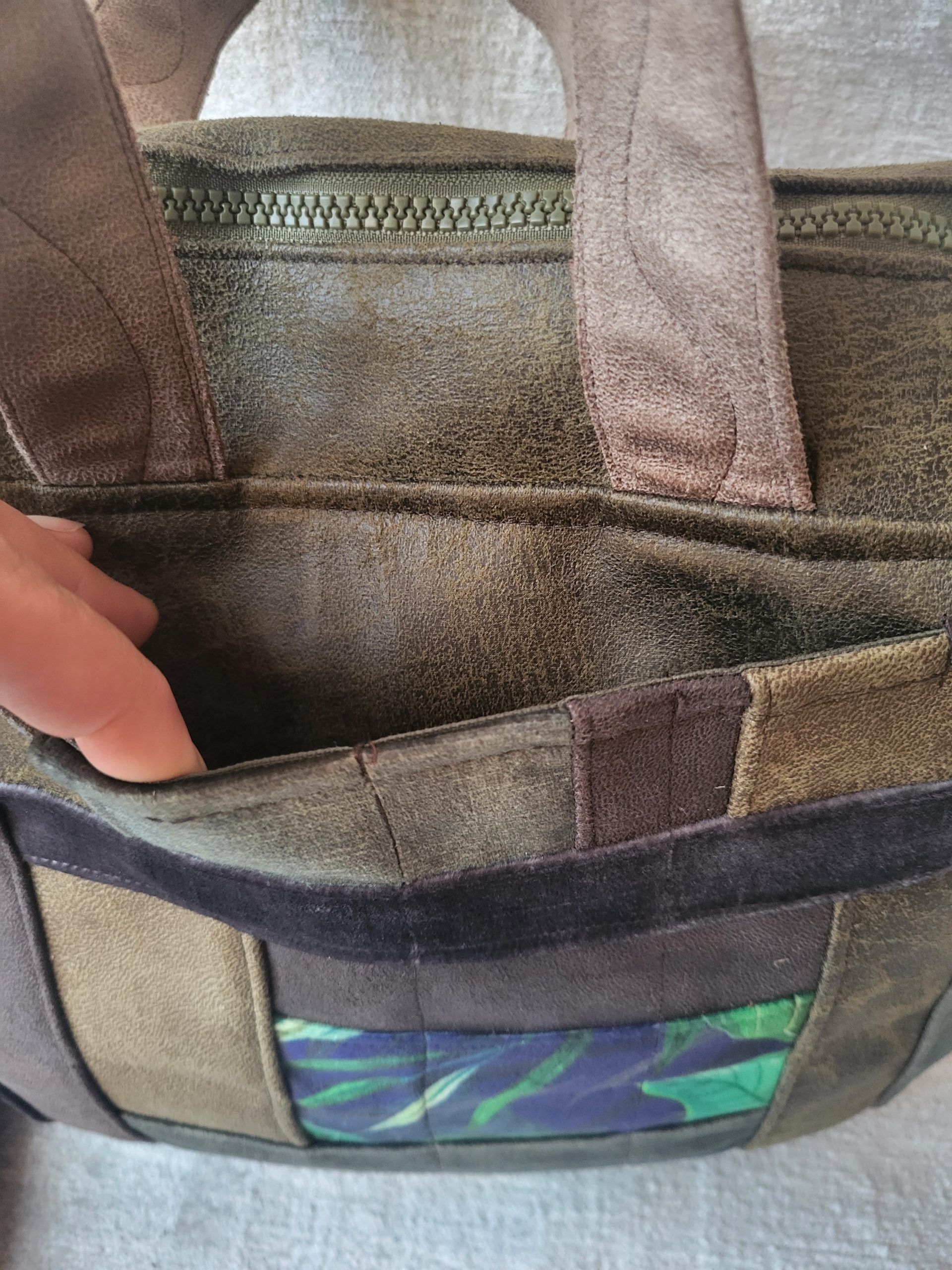 Torebka „Midi” czyli średniej wielkości, wykonana ze skóry i weluru tapicerskiego.
