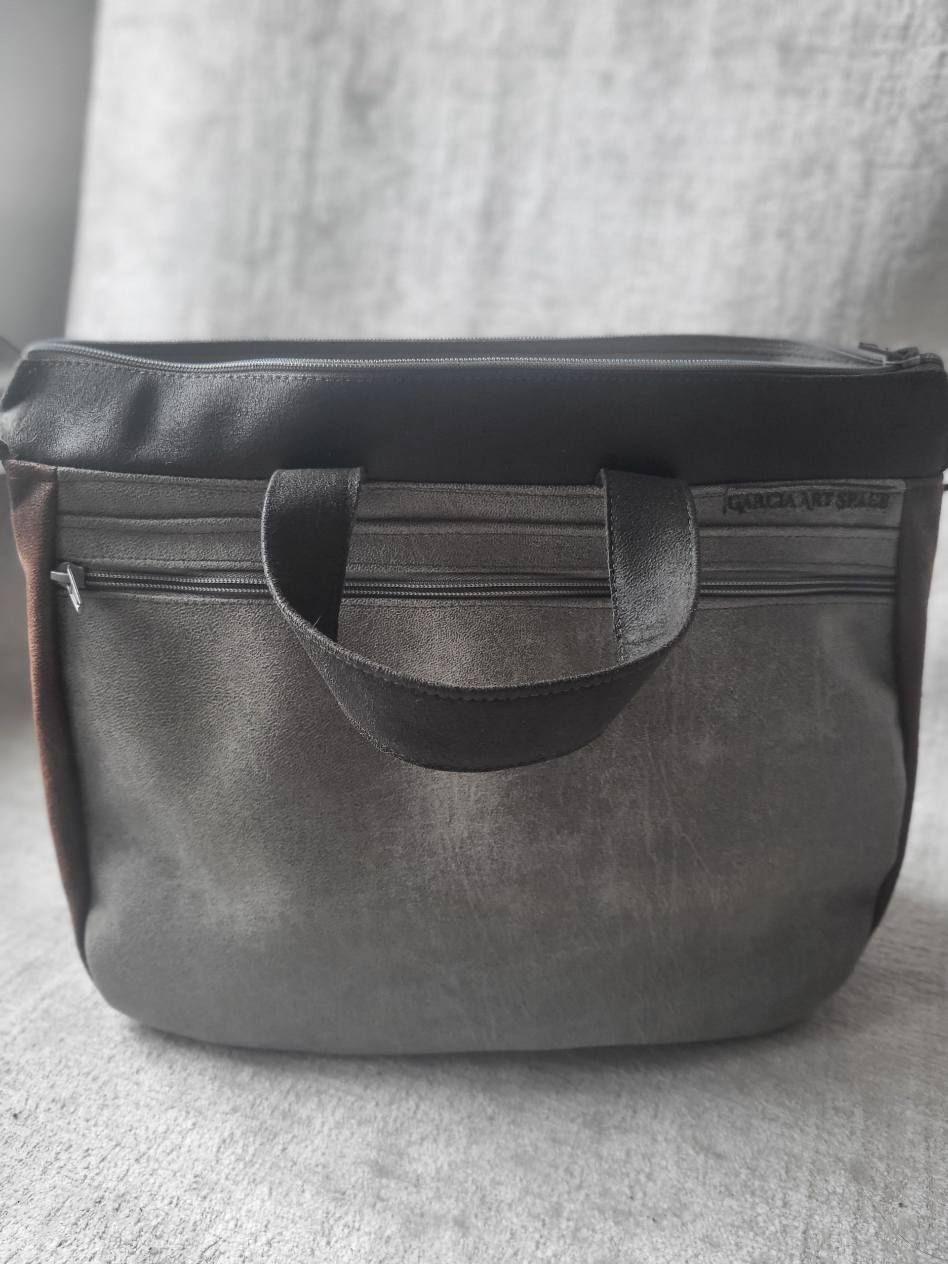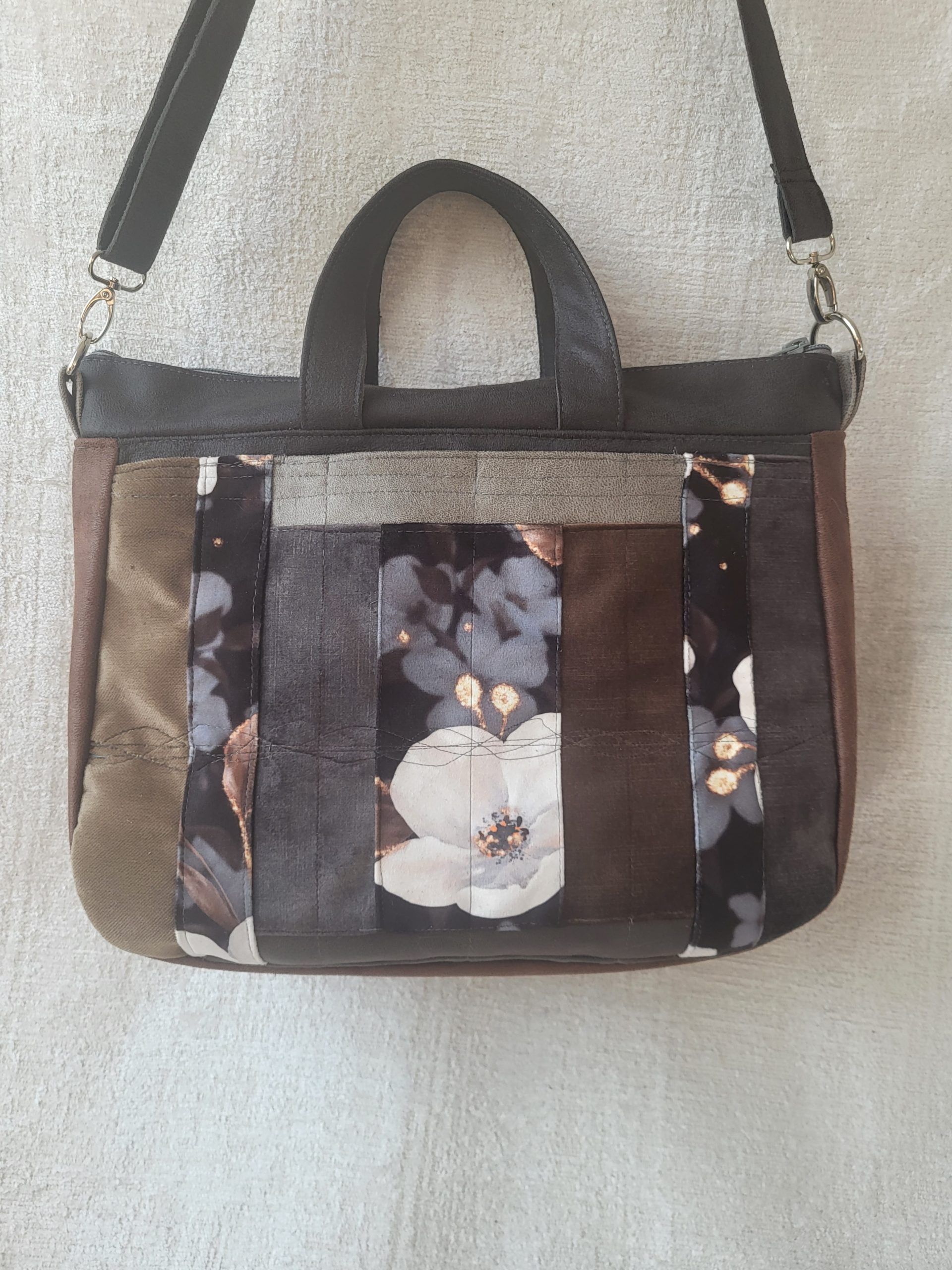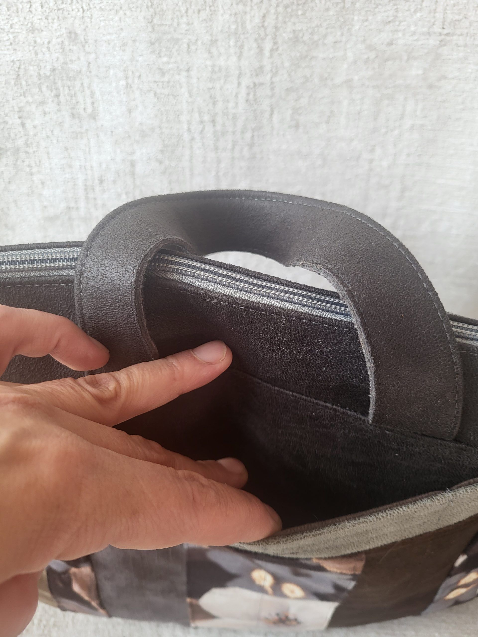Torebka „Midi” czyli średniej wielkości, wykonana ze skóry i weluru tapicerskiego.