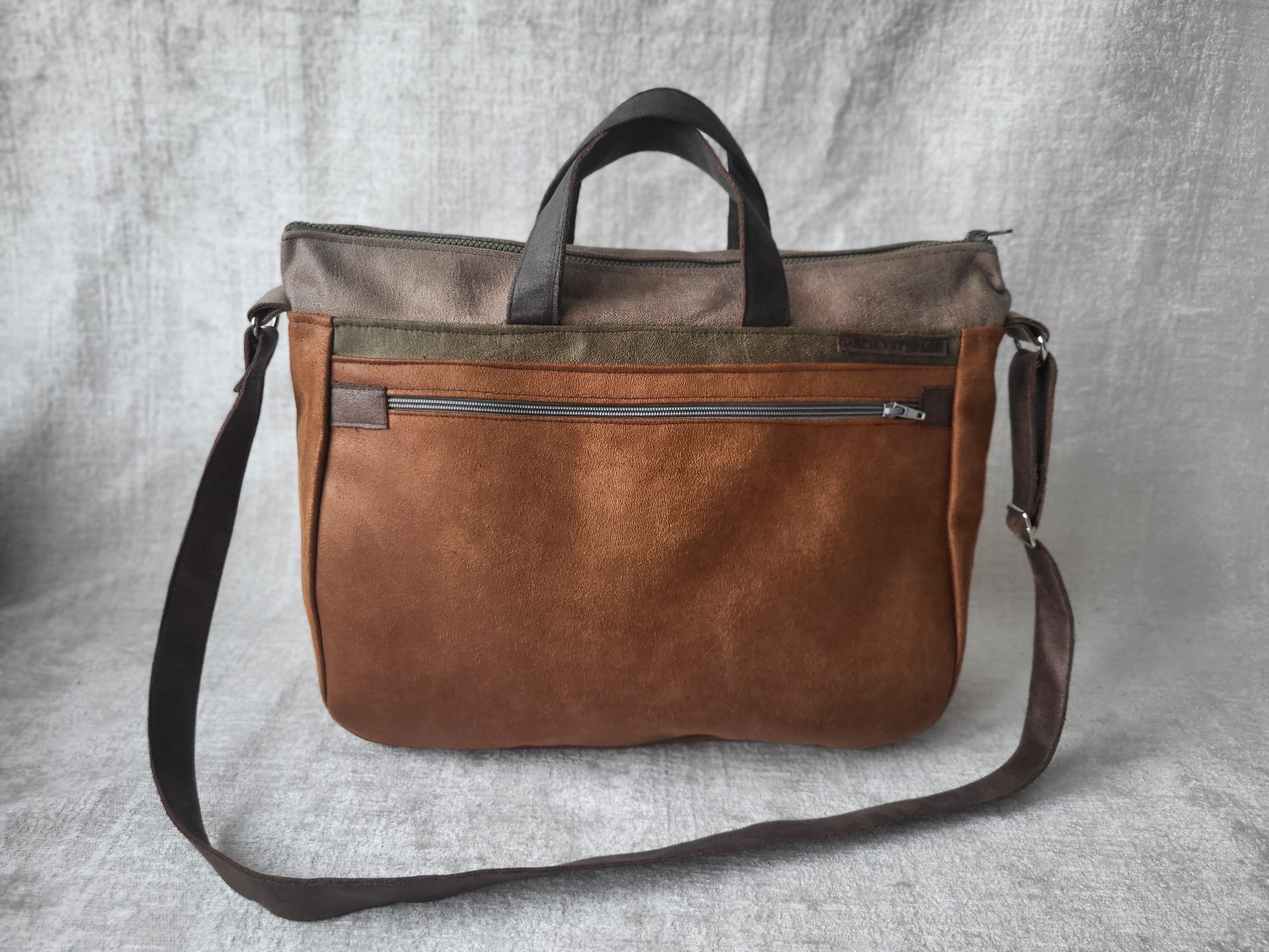 Torebka „Maxi” czyli dużej wielkości, wykonana ze skóry i weluru tapicerskiego.