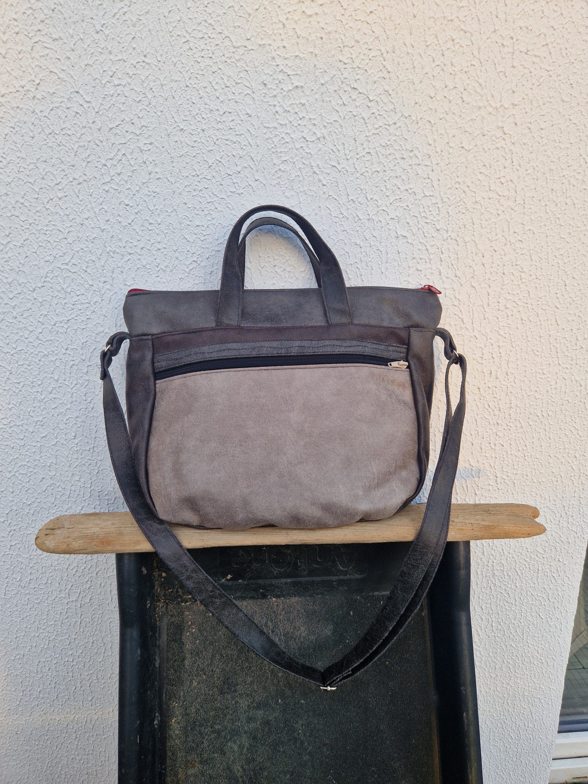 Torebka „Ursa”, czyli średniej wielkości, wykonana ze skóry i weluru tapicerskiego.