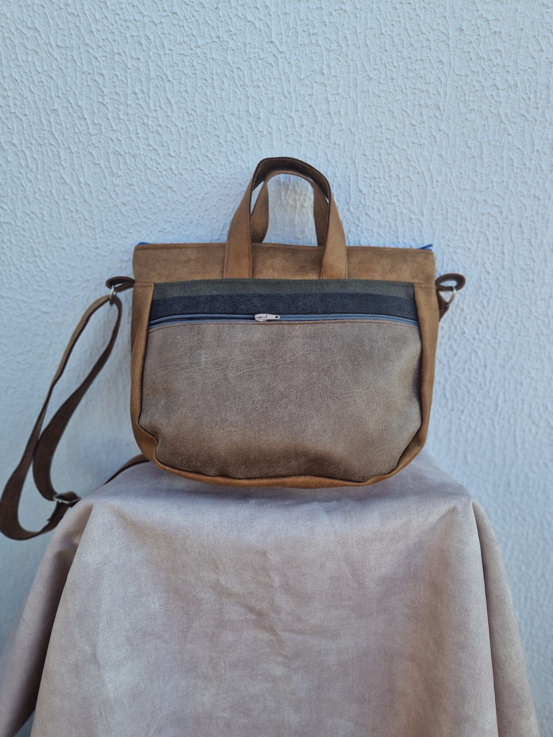 Torebka „Ursa”, czyli średniej wielkości, wykonana ze skóry i weluru tapicerskiego.