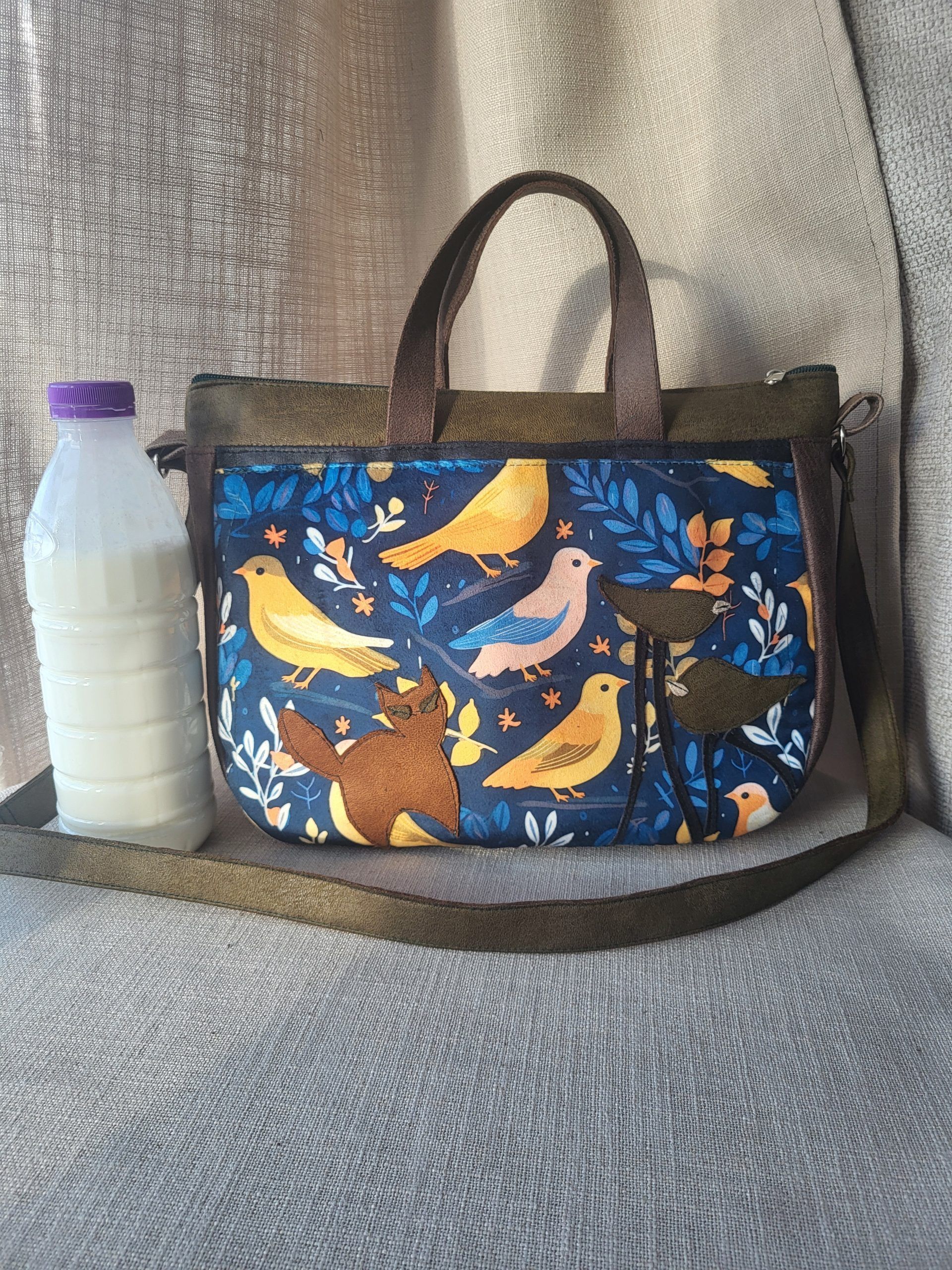 Z przodu został uszyty patchwork tworząc unikalny wzór, często z dodatkiem aplikacji.